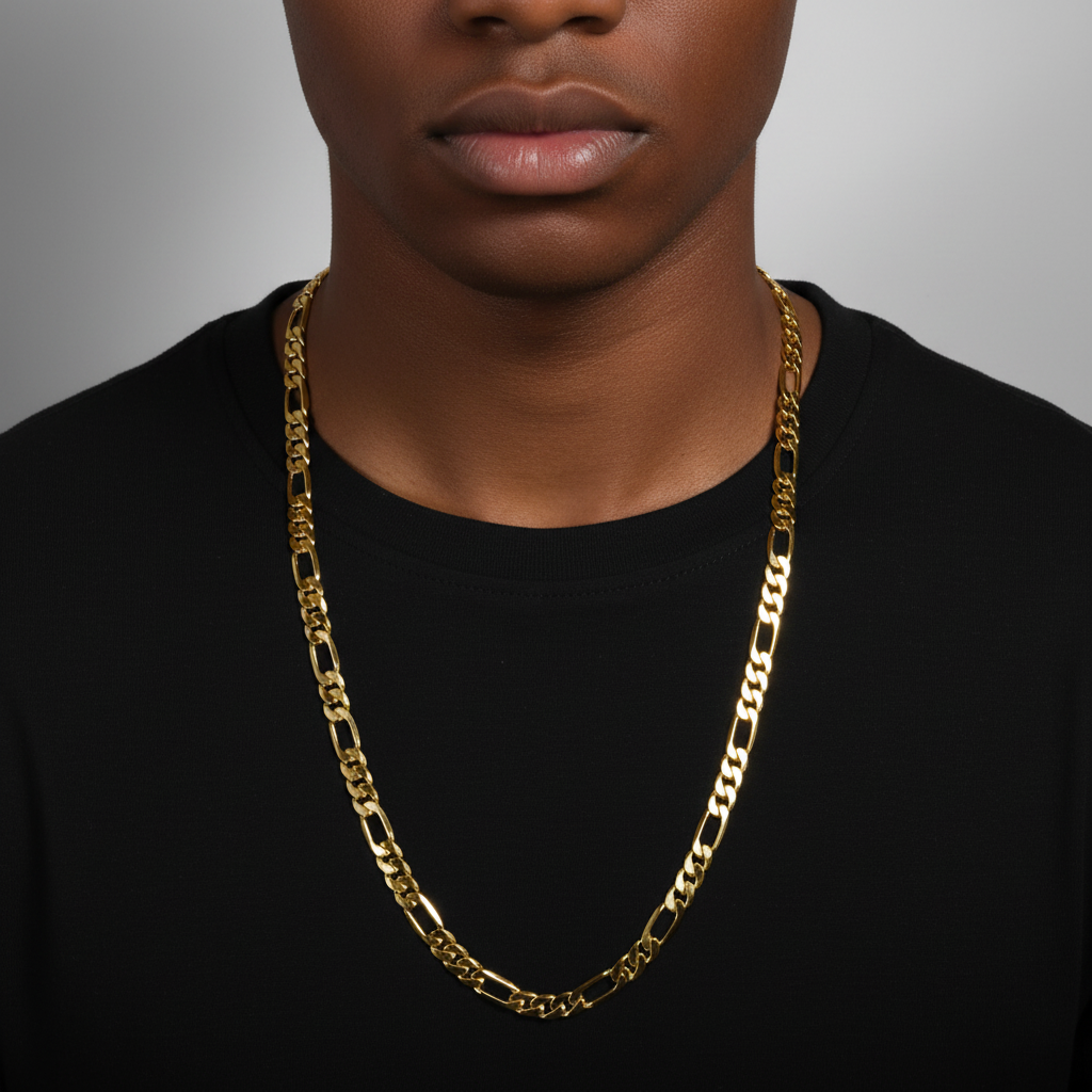 This full size Gold plated Figaro Chain is laser coated, with 50 mills of high polished Gold for lasting brilliance.
