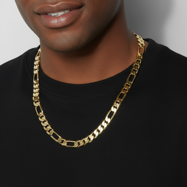 •Link - Figaro •Width: 11 mm---This chain is a Big size and ideal for men.•Length: 24" INCH •Closure: Lobster clasp •Plating: 14K Real Gold (2MIS Electro)The piece is "14k GOLD" polished for the...