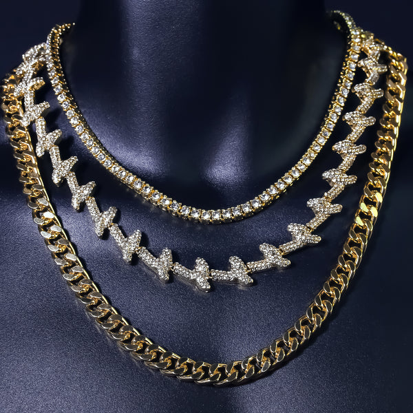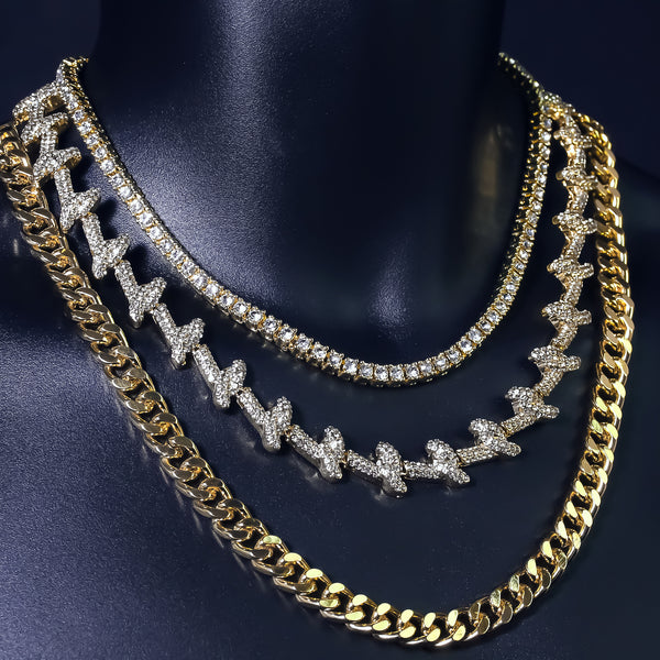 1 Row Cz Tennis Chain Length: 18" Inches Width: 5mm Cz Barbed Wire Style Chain Length: 20"Inches Width:10mm 14k Gold Plated Miami Cuban Chain Length: 24"Inches Width: 10mm High-impact 14k Gold...
