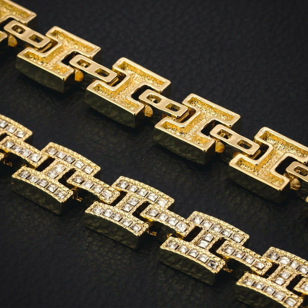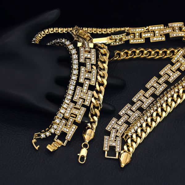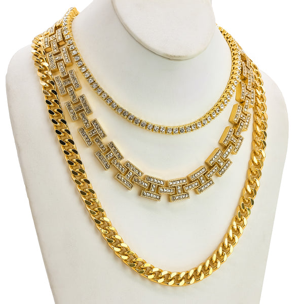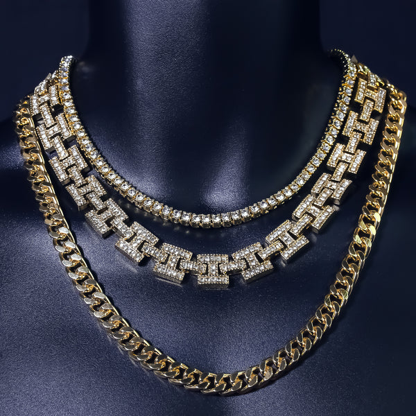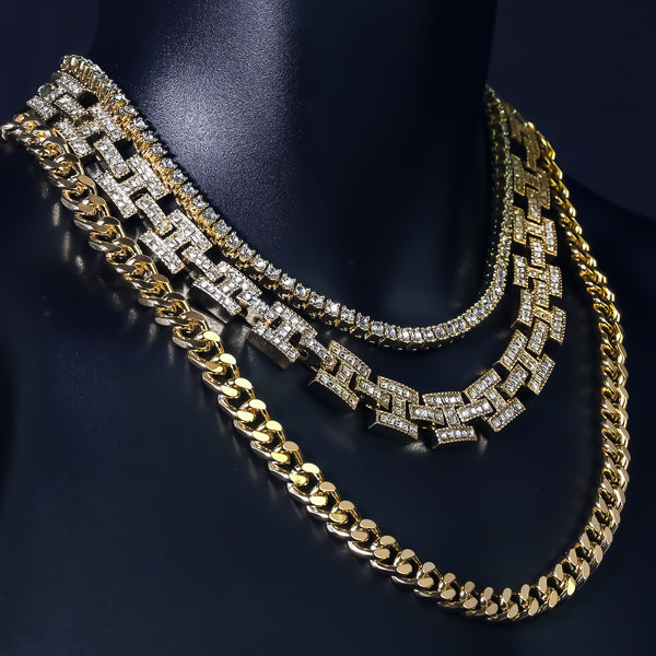 1 Row Cz Tennis Chain Length: 18" Inches Width: 5mm Cz H Style Link Chain Length: 20"Inches Width:10mm 14k Gold Plated Miami Cuban Chain Length: 24"Inches Width: 10mm High-impact 14k Gold Plating,...