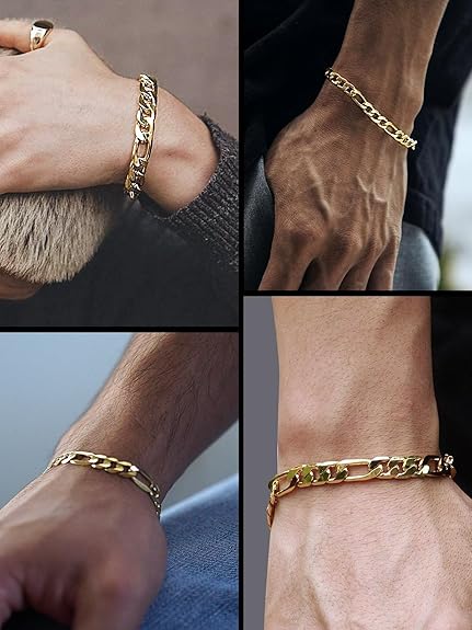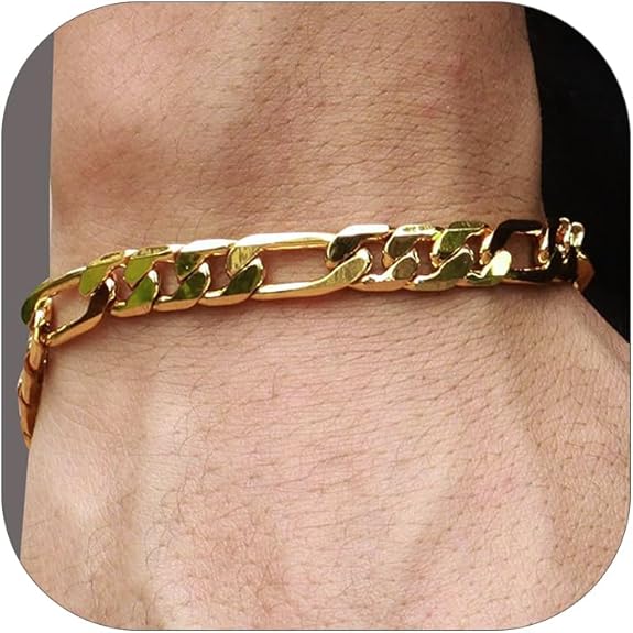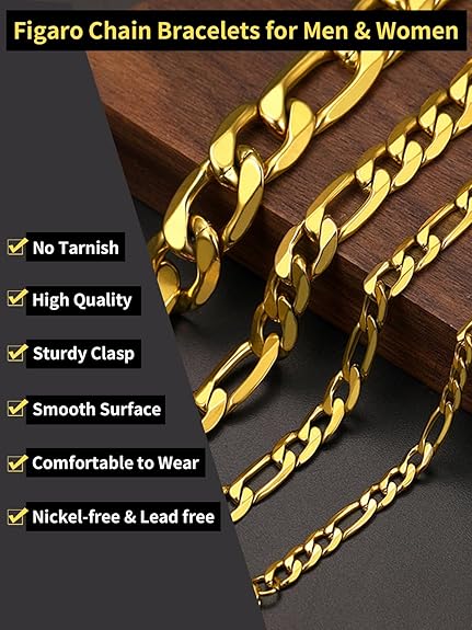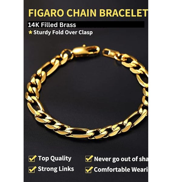 Chain Origin: Korea, Stamp: 14K, Plating: Real Gold, Size: 4mm-12mm BRAND NEW 14K GOLD FINISH 4MM WIDE FIGARO LINK BRACELETThis Gold plated heavy Figaro Bracelet is laser coated, with 50 mills of high polished...