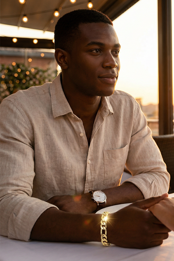 BRAND NEW 14K GOLD FINISH 9MM WIDE FIGARO LINK BRACELETThis Gold plated heavy Figaro Bracelet is laser coated, with 50 mills of high polished Gold for lasting brilliance. The piece is...