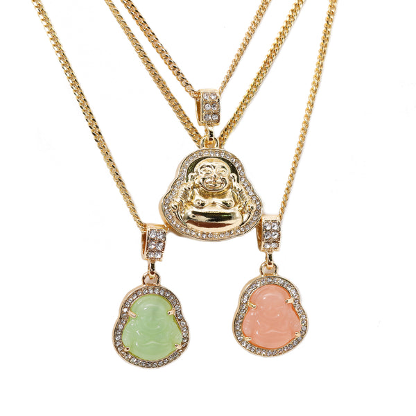 14k Gold Plated Light Pink, Light Green Buddha 3 Pendant Cubic-Zirconia 30 30 24 Cuban Chain