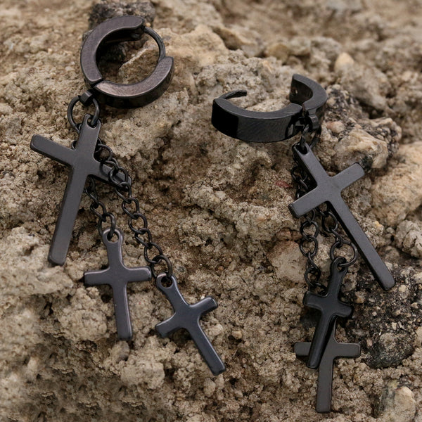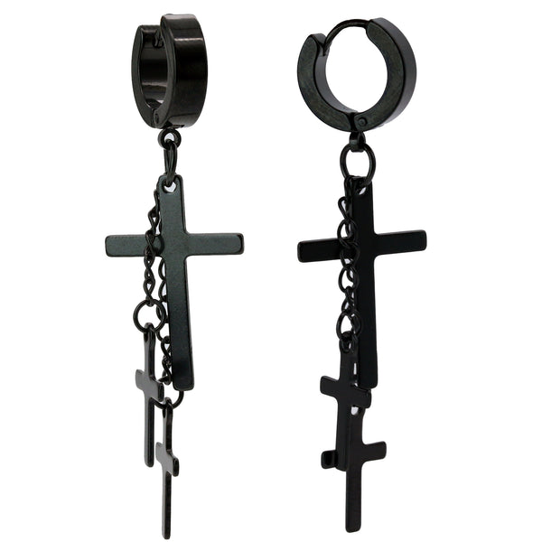 18k Stainless Steel Black 3 Cross Dangle Huggie Hoop EARRING