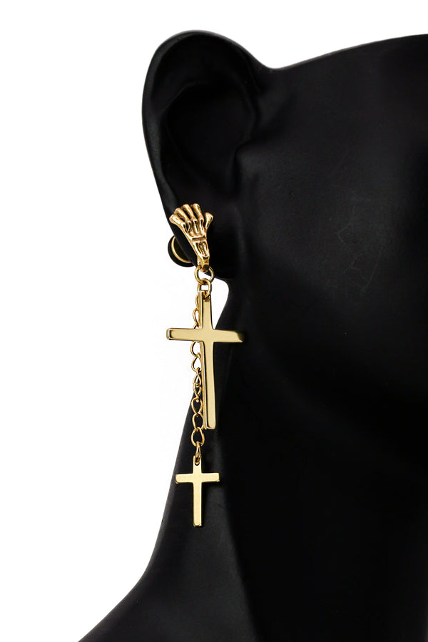 2 Cross Dangle Skeleton Hand 18k Gold SST Plain Earring
