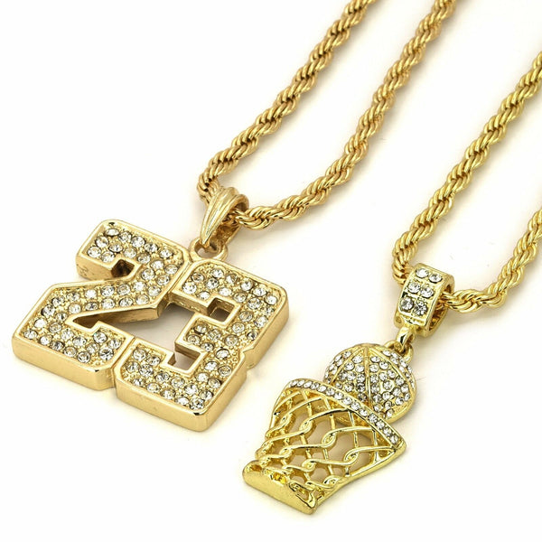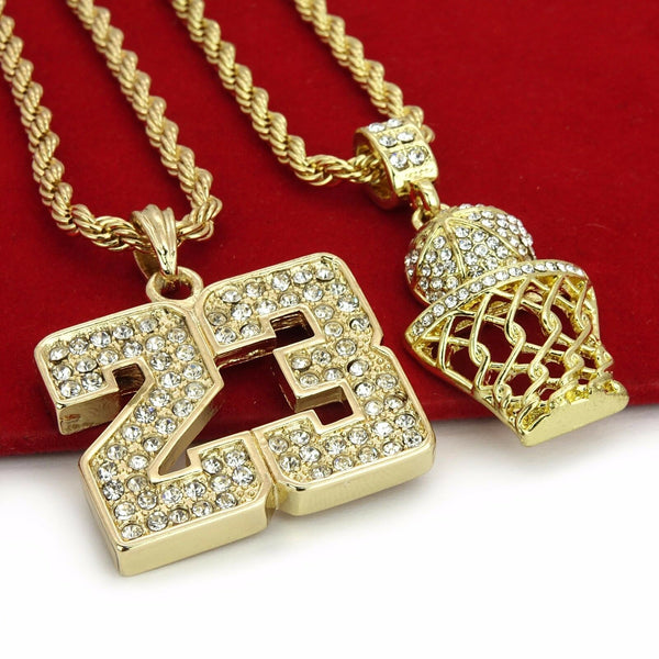 Hip Hop Bling 14K Gold Filled Necklace Pendant 14K Gold Filled Iced OutĀ 23 and BasketballĀ Hip Hop Pendanst with 4 mm 24'' Rope Chains Gold Filled Over Brass Makes this Necklace...