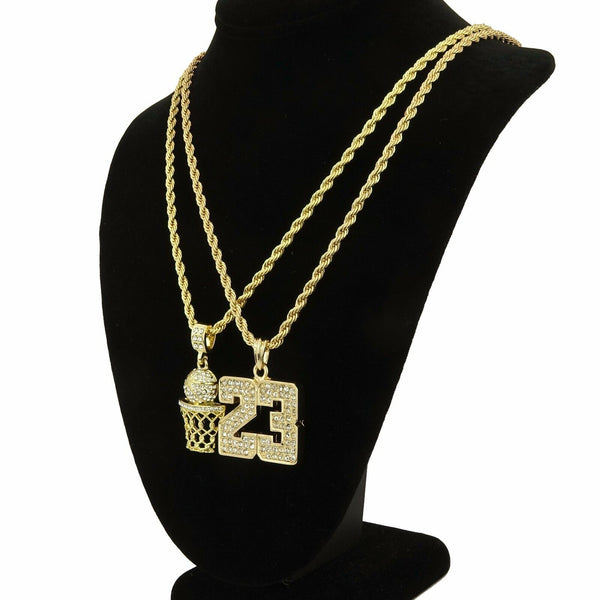 23 BASKETBALL DOUBLE PENDANT WITH GOLD ROPE CHAIN