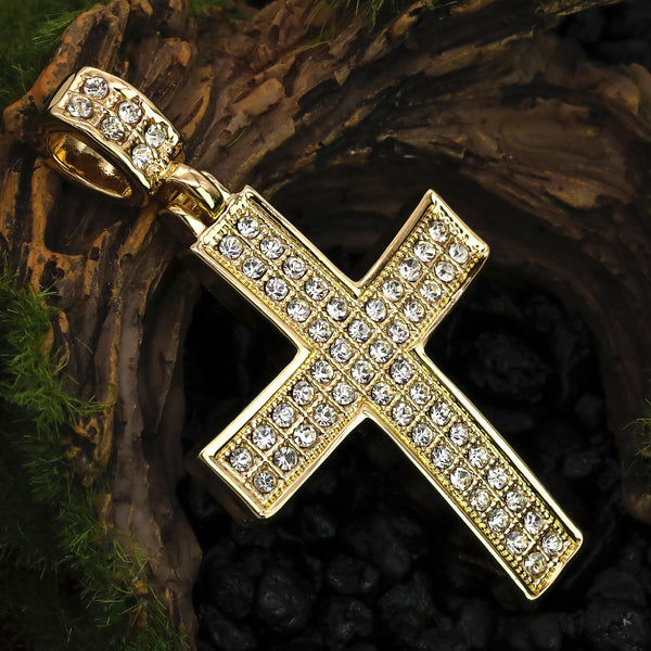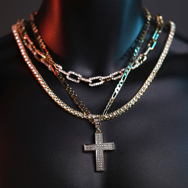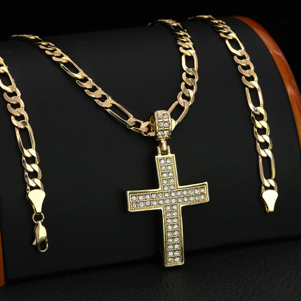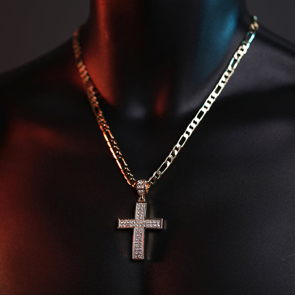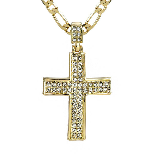 2Row Cz Cross Pendant 20" Figaro Chain Hip Hop Style 18k Gold Plated