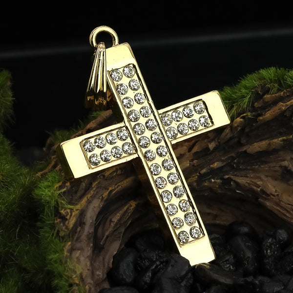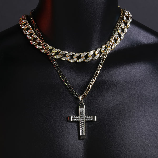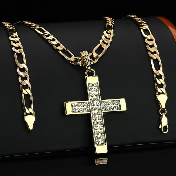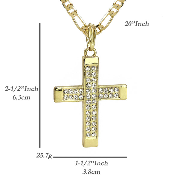 2Row Cz Pillar Cross Pendant 20" Figaro Chain Hip Hop Style 18k Gold Plated