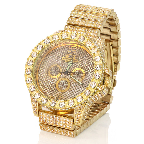 Techno Bling Fully Iced Metal Band Wrist Watch Big Size Face Diameter: 45mm Thickness: 15mm Stylish and trendy with scratch resistant mineral glass Bling Iced out bezel filled with lavish genuine Czech crystals...