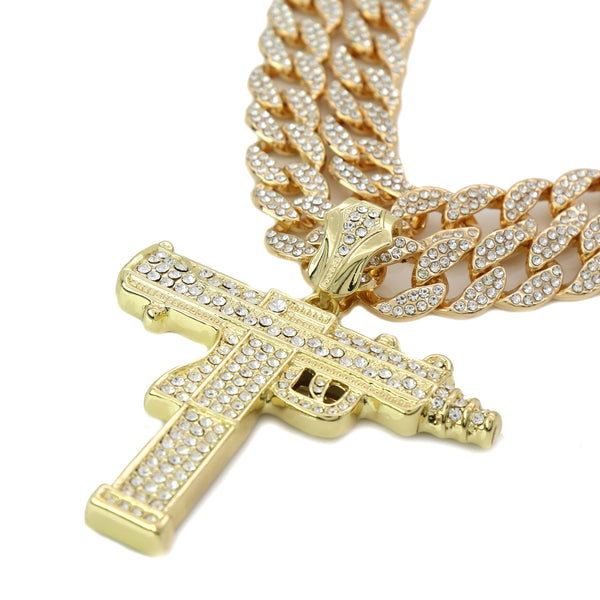 3pc Cz Large Uzi Gun Pendant Gold Plated 18, 20" Fully Cz Cuban Choker Chain