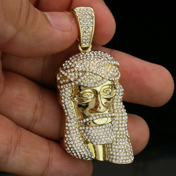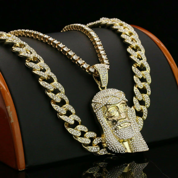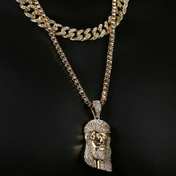 3pc Men's Gold Plated Cz Thick Jesus Face w/ Cz Cuban & Thin Tennis Chain 22"/24