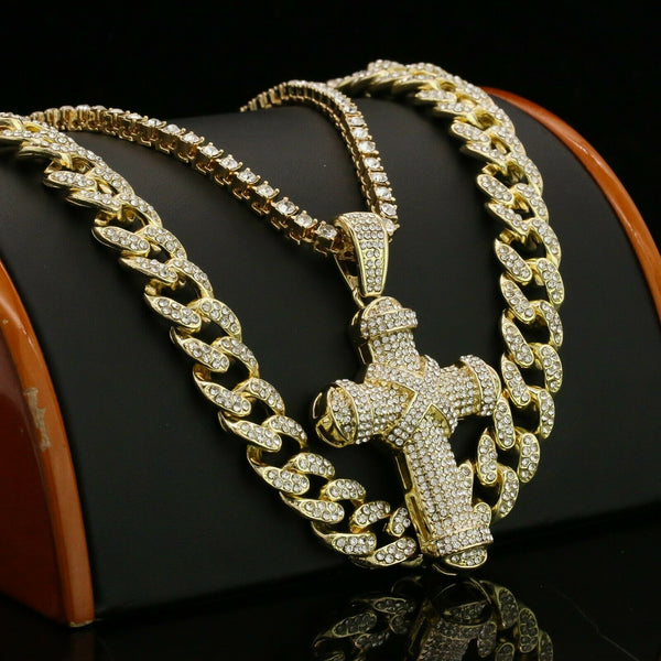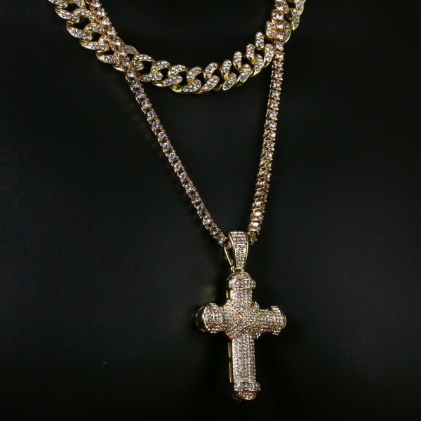 3pc Men's Gold Plated Cz Thick Staple X Cross w/ Cz Cuban & Thin Tennis Chain 22"/24