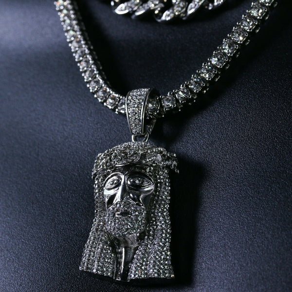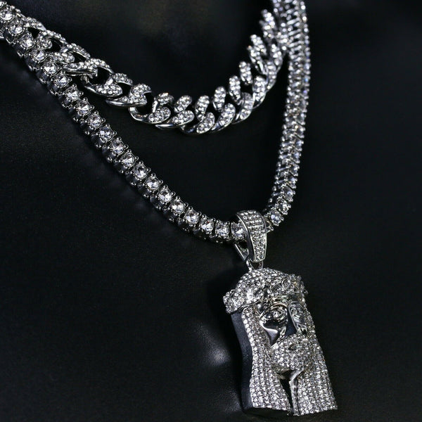 3pc Men's Silver Plated Cz Thick Jesus Crown w/ Cz Cuban & Tennis Chain 18"/20"