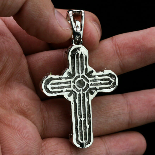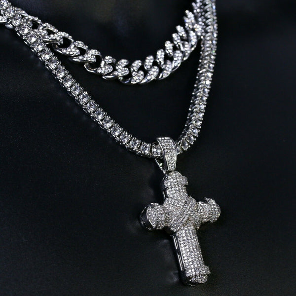 3pc Men's Silver Plated Cz Thick Staple X Cross w/ Cz Cuban & Tennis Chain 18"/20"
