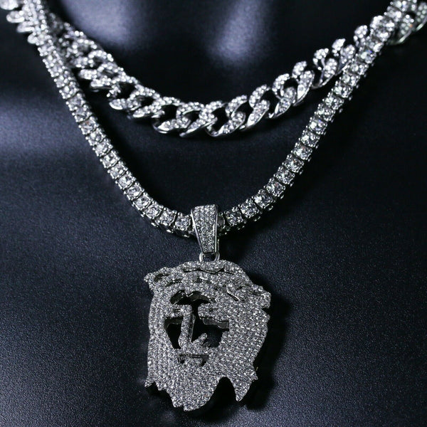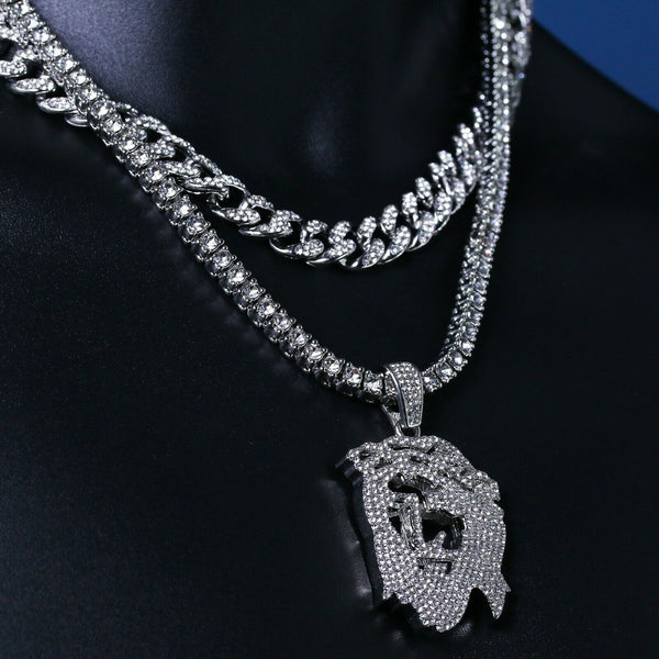3pc Silver Plated Thick Hollow Jesus w/ Fully Cz Cuban & Tennis Chain 18"/20"