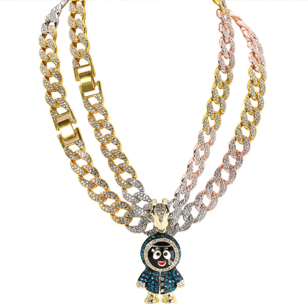 3pc Set Hip Hop Small Brick Squad Eskimo Pendant & Fully Iced 3 Tone Cuban Chain Necklace – 15mm 18"/20" Cuban Chain