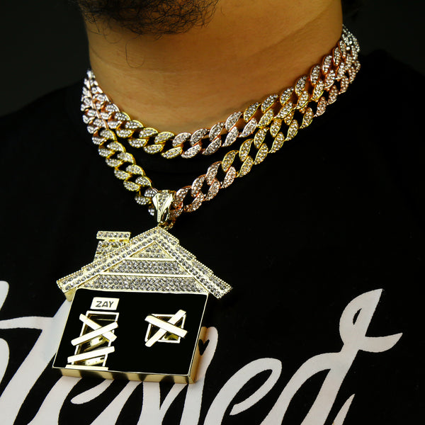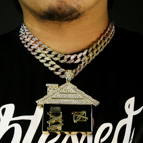 3pc Set – Huge Bando House Pendant & 3-Tone Iced Cuban Chains 18"/20"