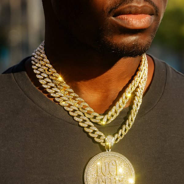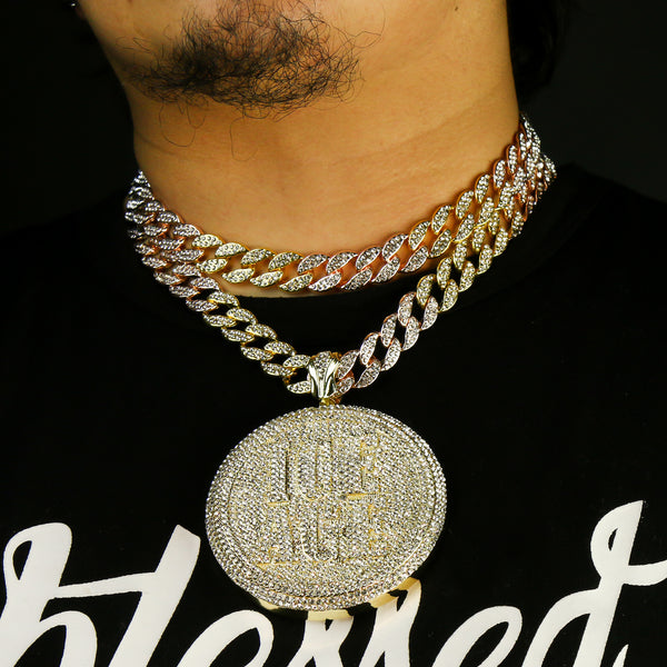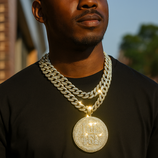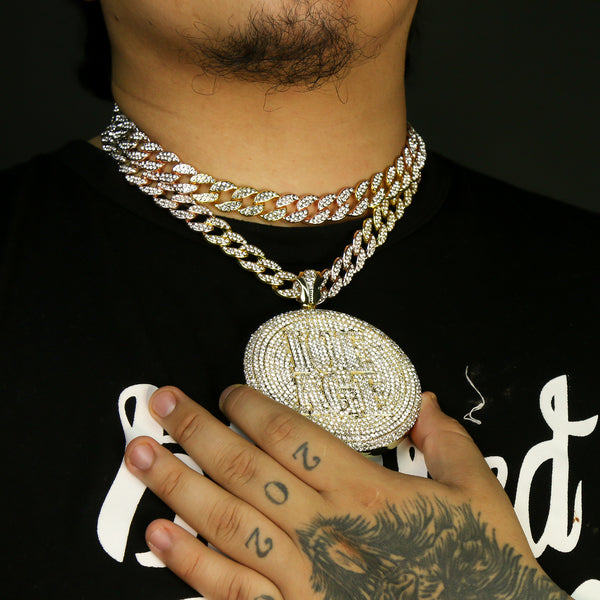 Make a statement with the 3pc Set featuring the massive ICE AGE round pendant and two fully iced-out 3-tone Cuban chains. Inspired by the iconic Miami Cuban Curb, this set...