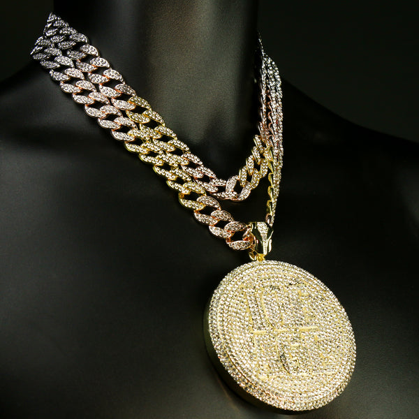 3pc Set – Huge ICE AGE Round Pendant & 3-Tone Iced Cuban Chains 18"/20"