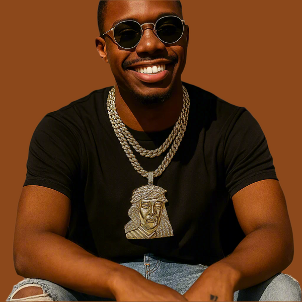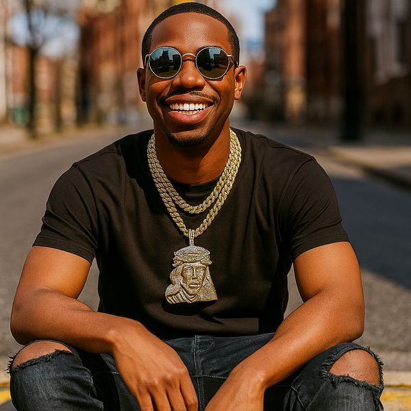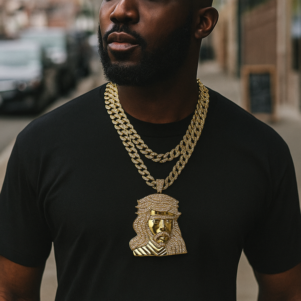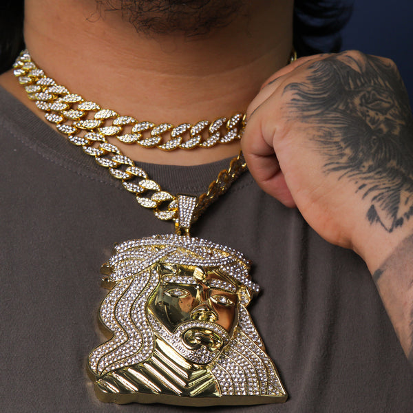 Turn heads with this bold 3-piece set featuring a Huge XXL Wide Face Jesus Pendant and two fully iced-out 15mm Cuban chains in 18" and 20". Crafted for those who...