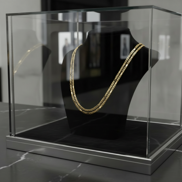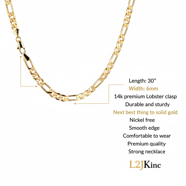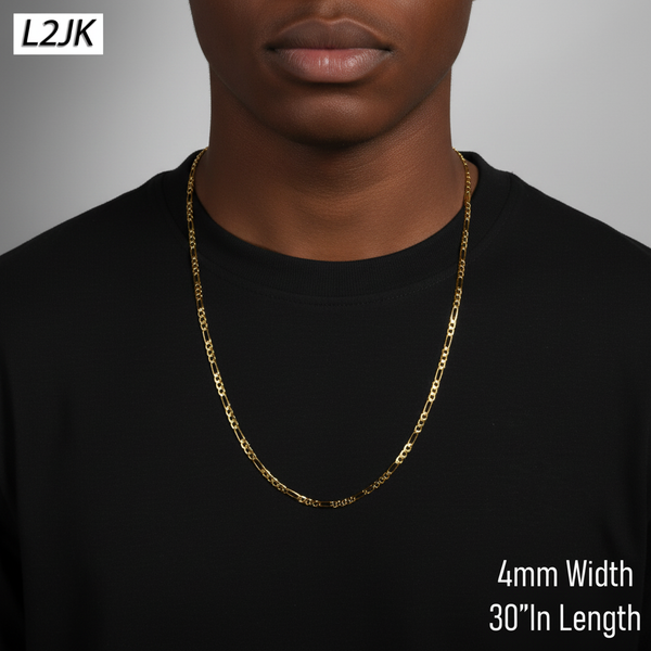 •Link - Figaro •Width: 4 mm---This chain is a medium size and ideal for men and ladies•Length: 30" INCH •Closure: Lobster clasp •Plating: 14K Real Gold (2MIS Electro)The piece is "14k GOLD" polished...