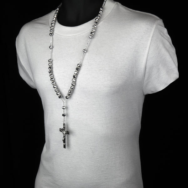 8MM GRAY Crystal Rosary 32" & Jesus Cross Pendant
