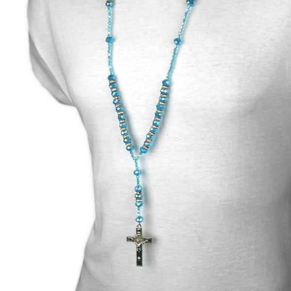 Light Blue Crystal Beads Rosary With Jesus Cross Pendant. Fashion Religious Jewelry Necklace that fit for all, Men, Women, Boy or Girl Each Bead of the Necklace is Carefully checked Before Attached...