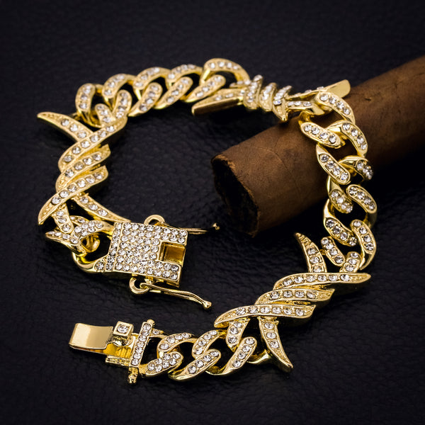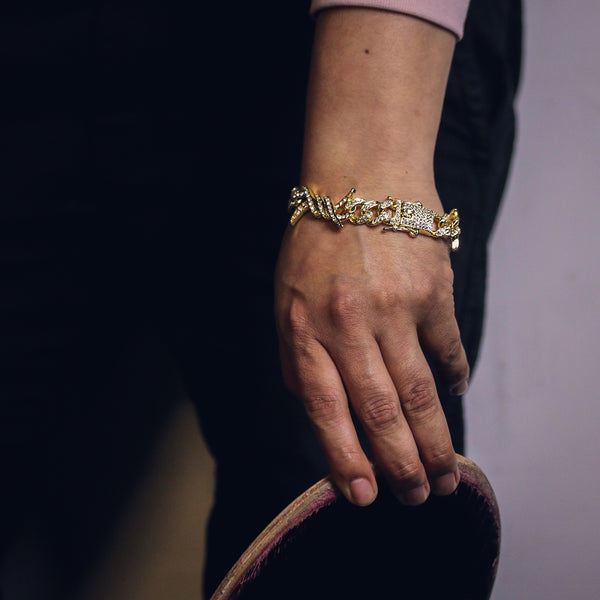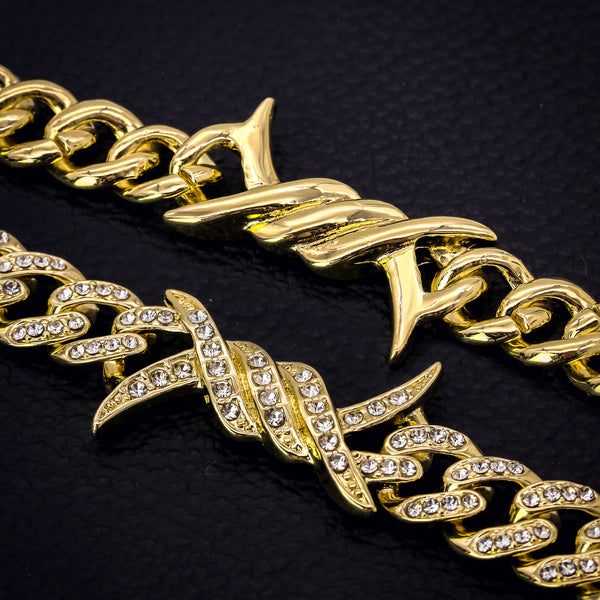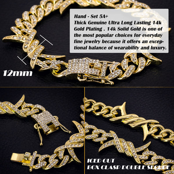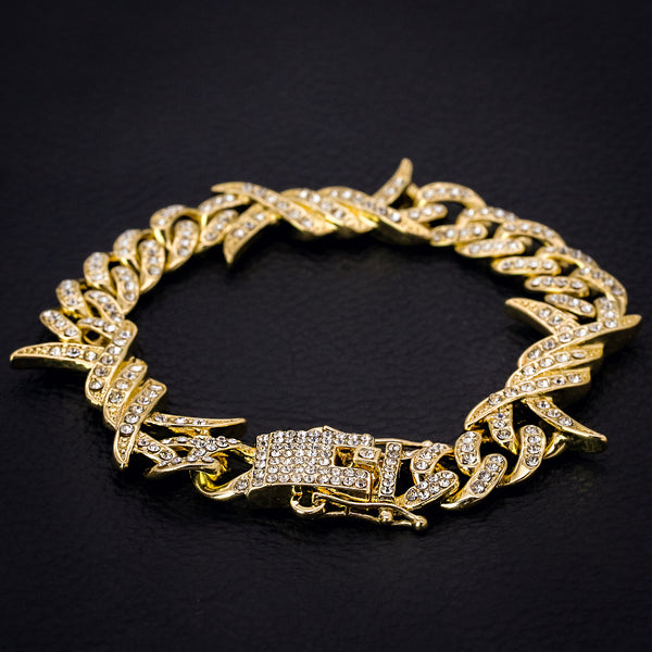 Barbed Wire Bracelet Cuban Link Iced 14k Gold Plated 9"