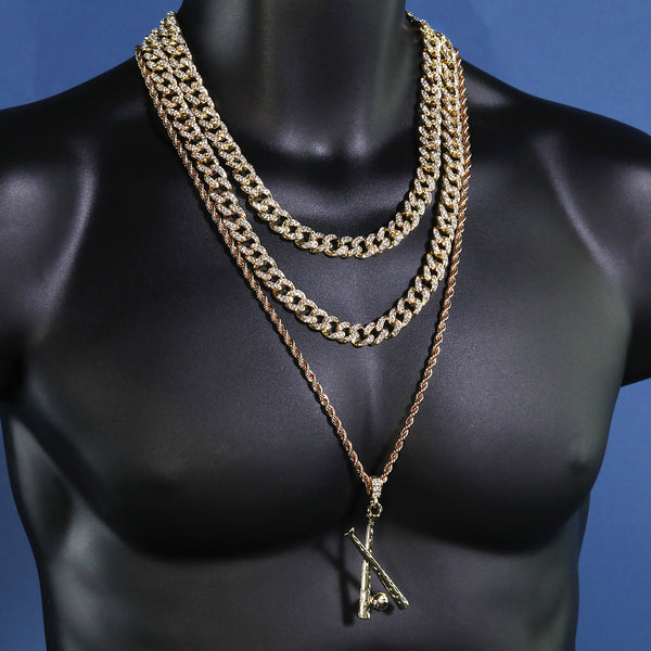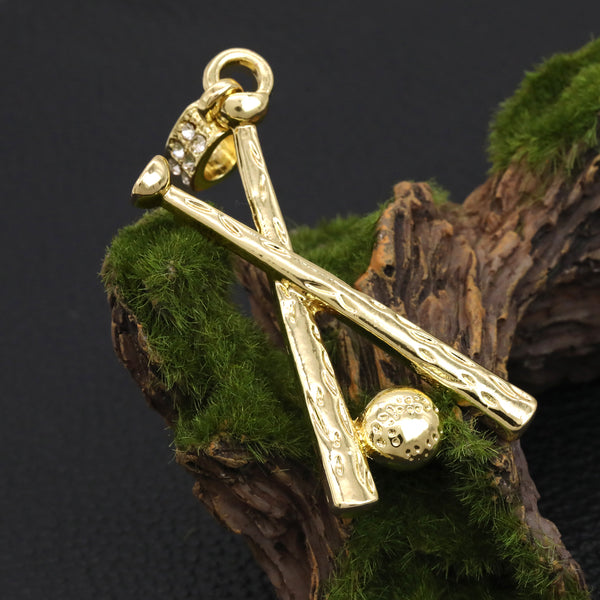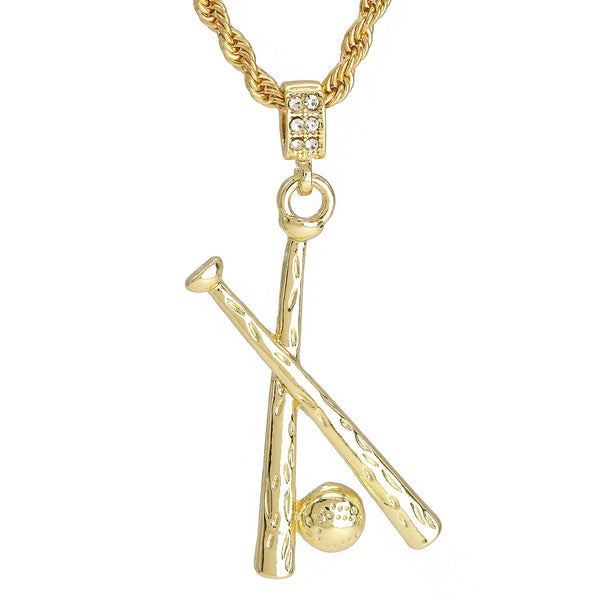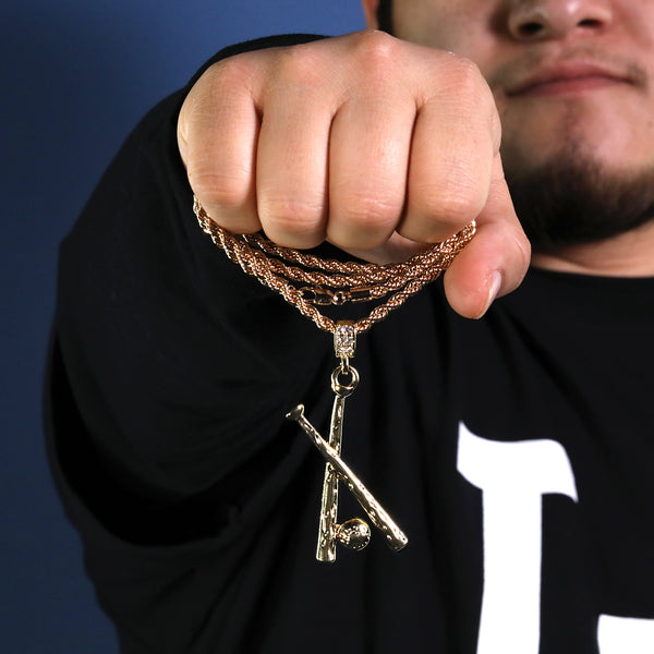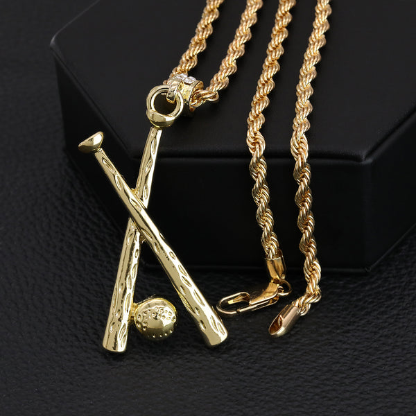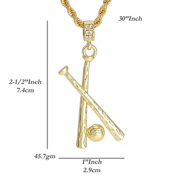 Baseball & Bat Pendant 30" Rope Chain Hip Hop Style 18k Gold Plated