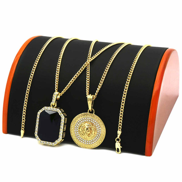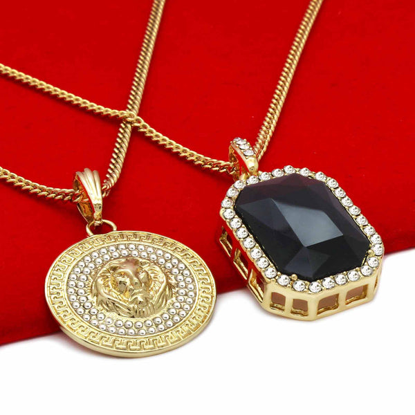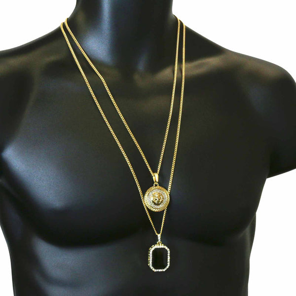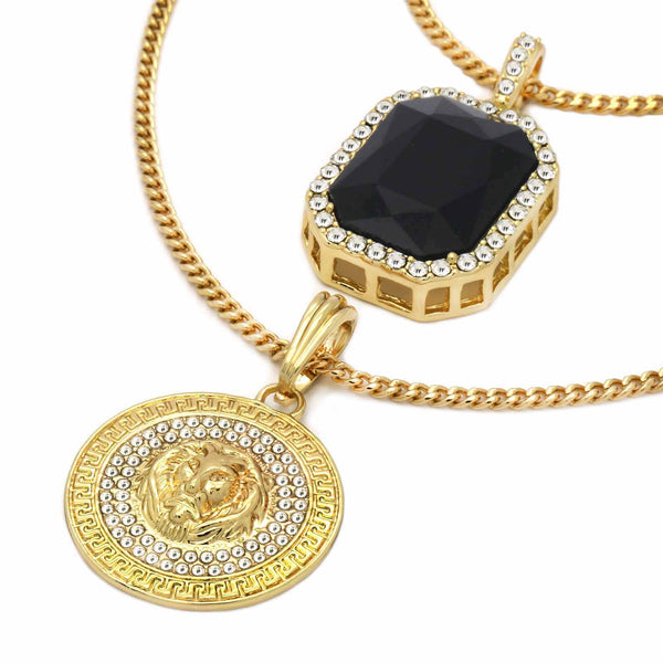 BLACK ONYX AND LION DOUBLE PENDANT WITH CUBAN CHAIN