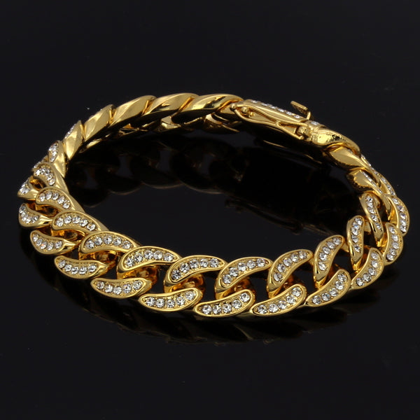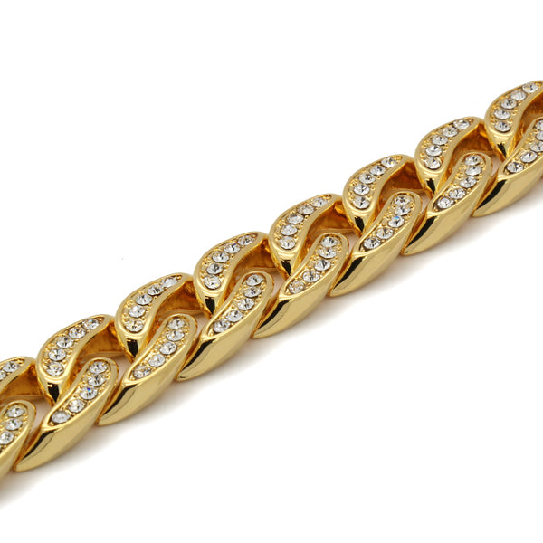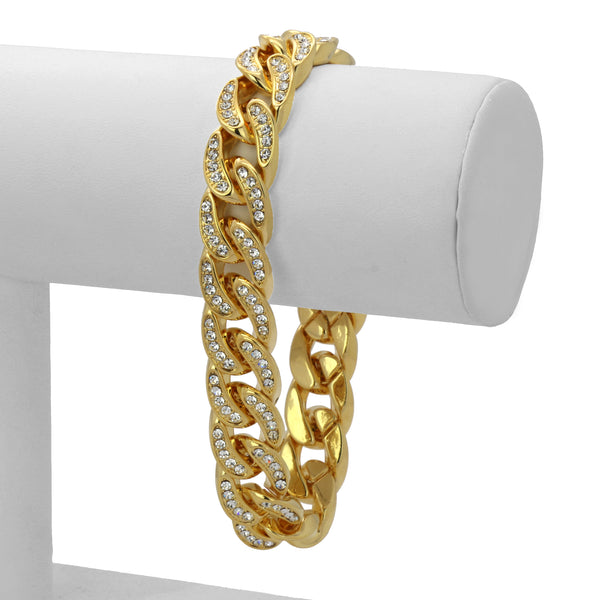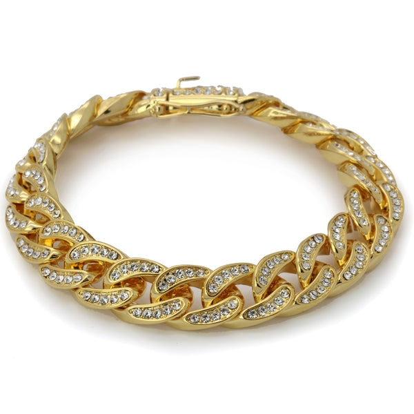 Elegant Cuban Real Gold Filled FULLY Iced Out Bracelet. Tarnishing Free "Life Time Guarantee" on Air Condition. High-impact 14k Gold Plating over Brass. Lustrous Cz Finish in front of every link....
