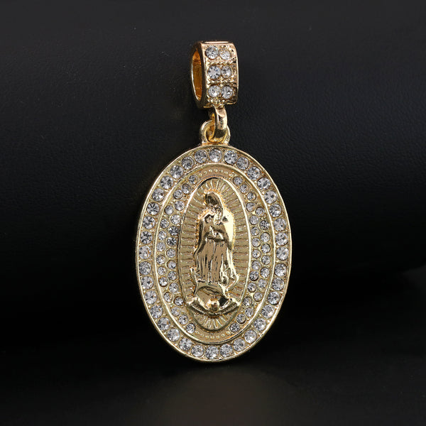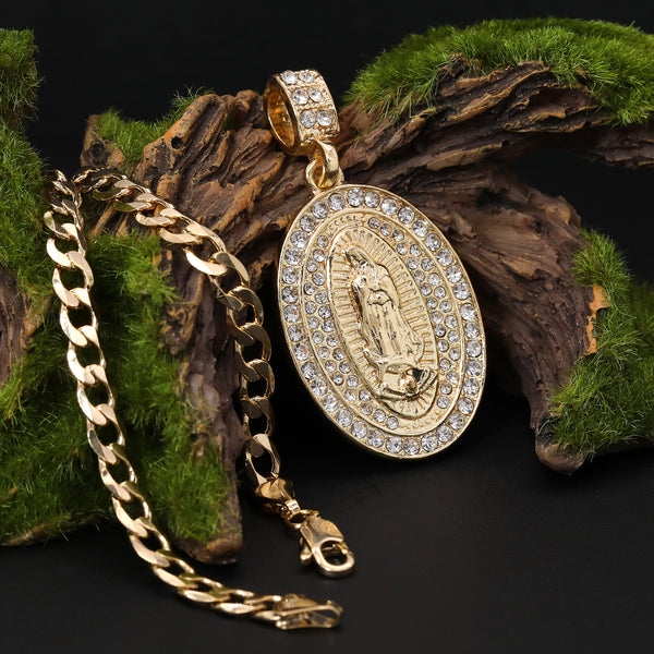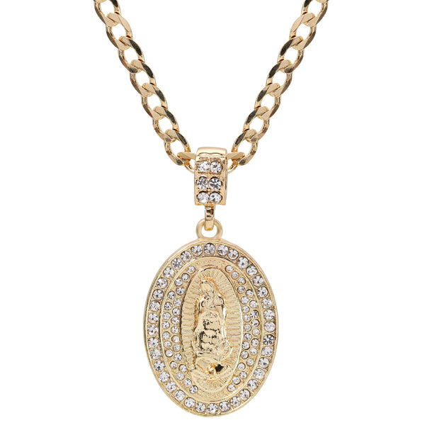 Catholic Guadalupe Oval Pendant Cubic-Zirconia Gold Plated 20" Cuban Chain Charm
