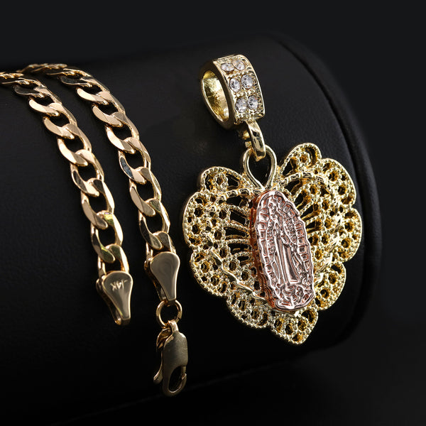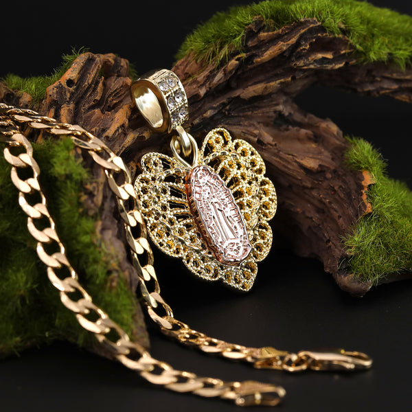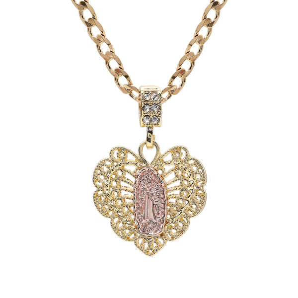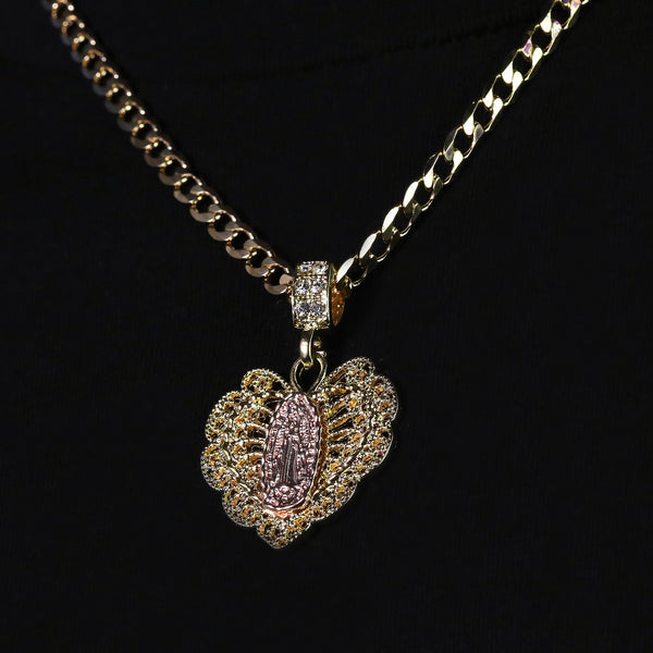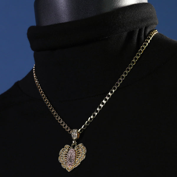 Catholic Heart Guadalupe Pendant Cubic-Zirconia Gold Plated 20" Cuban Chain