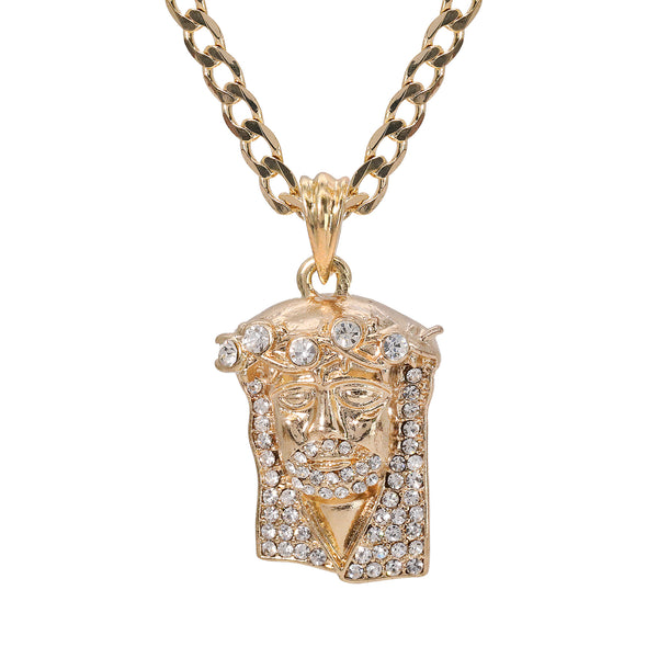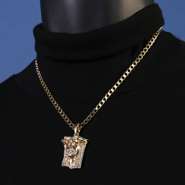 Catholic Jesus Face Big Crown Pendant Cubic-Zirconia Gold Plated 18" Cuban Chain
