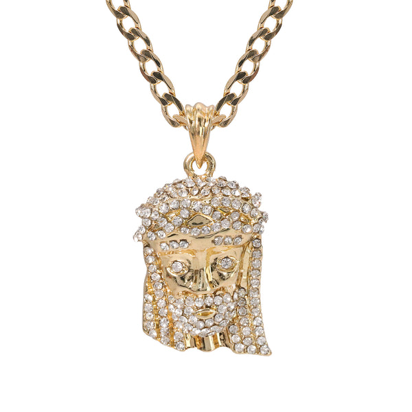 Catholic Jesus Face Pendant Cubic-Zirconia Gold Plated 18" Cuban Chain