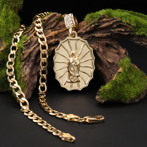 Catholic Oval Web Guadalupe Pendant Cubic-Zirconia Gold Plated 18" Cuban Chain