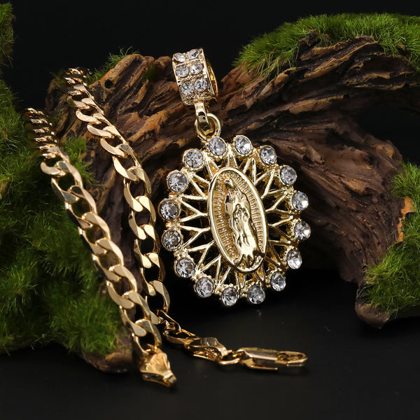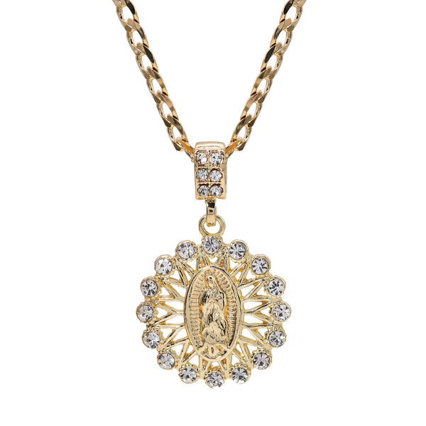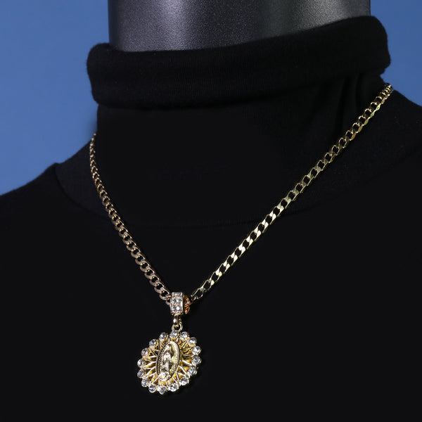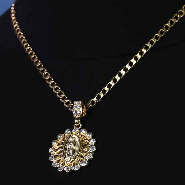 Catholic Round Guadalupe Pendant Cubic-Zirconia Gold Plated 20" Cuban Chain