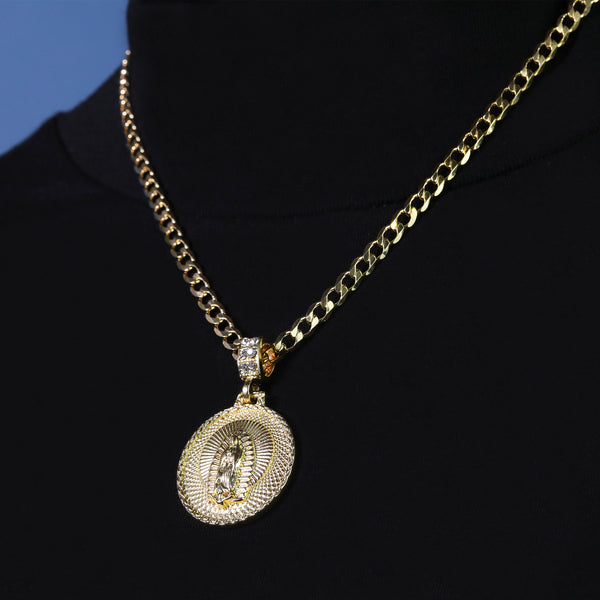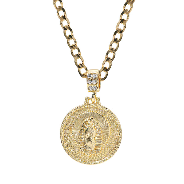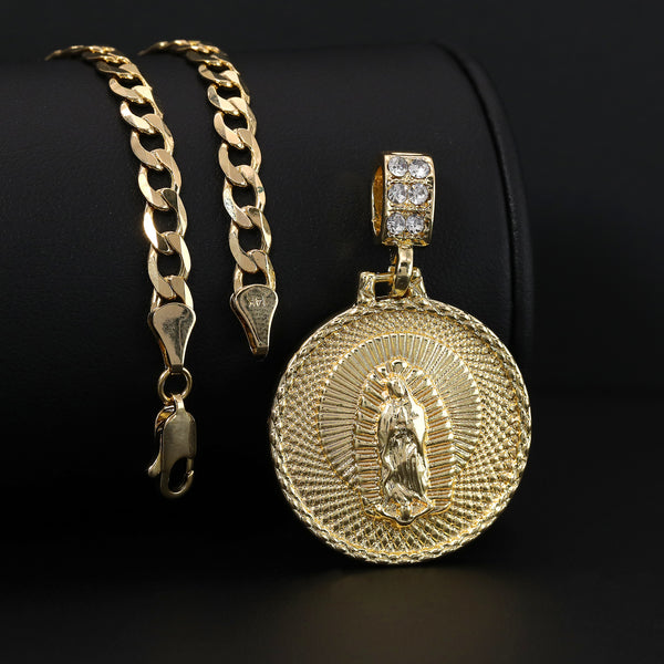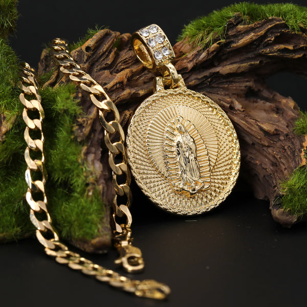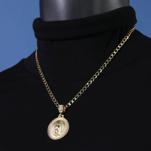 Catholic Round Web Guadalupe Pendant Cubic-Zirconia Gold Plated 20" Cuban Chain