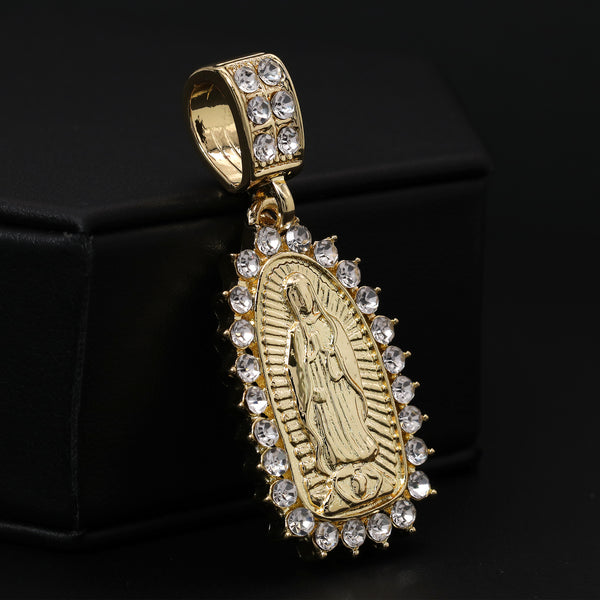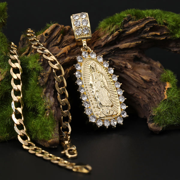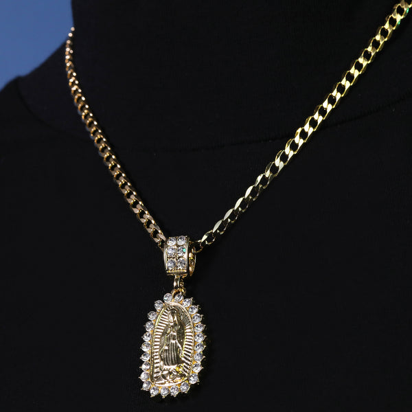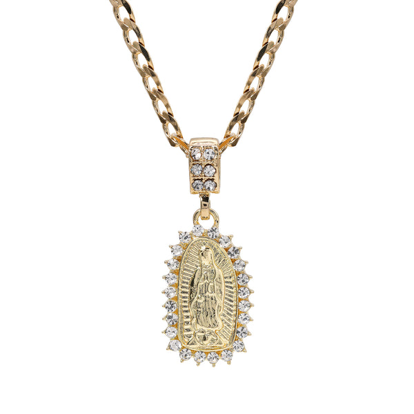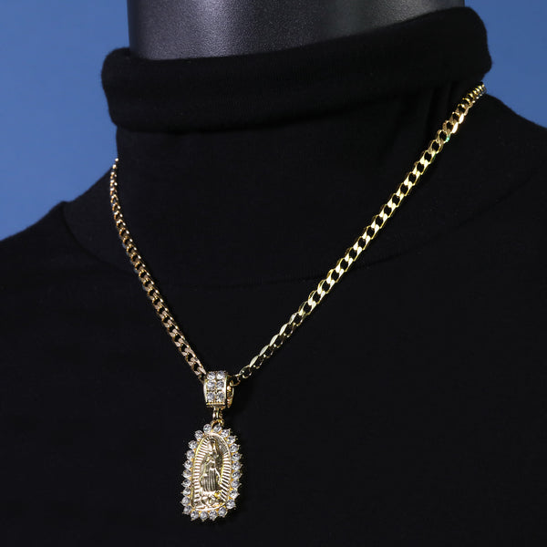 Catholic Spike Oval Guadalupe Pendant Cubic-Zirconia Gold Plated 20" Cuban Chain