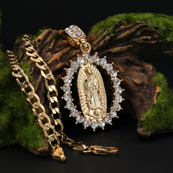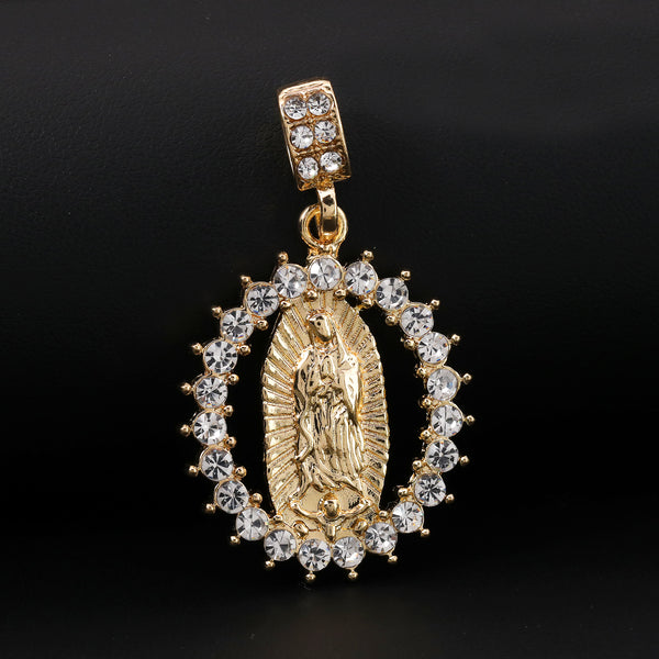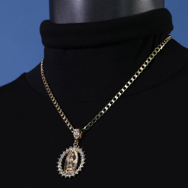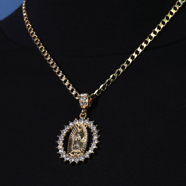 Catholic Spike Round Guadalupe Pendant Cubic-Zirconia Gold Plated 20 Cuban Chain
