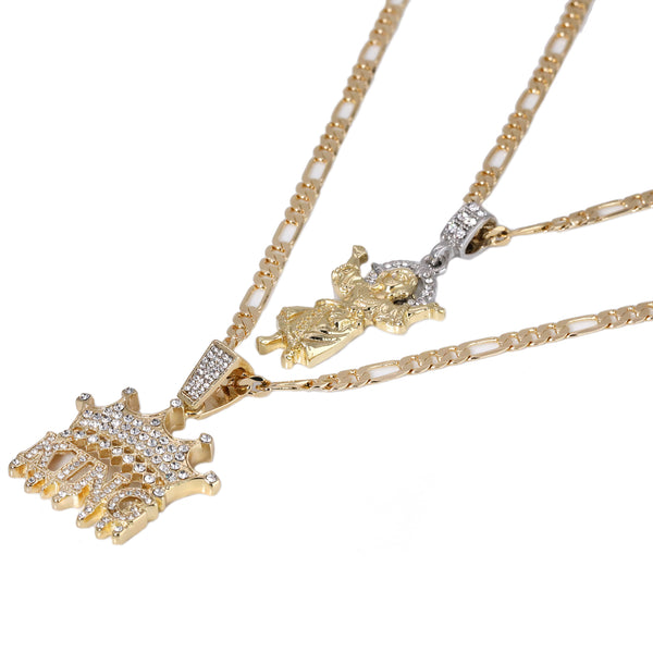 Child Jesus Worship & King Drip Pendant 20, 24" Cubic-Zirconia Gold Plated Figaro Chain