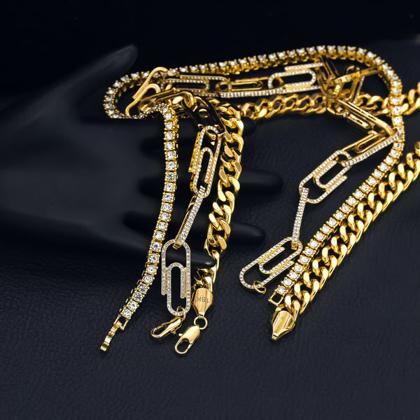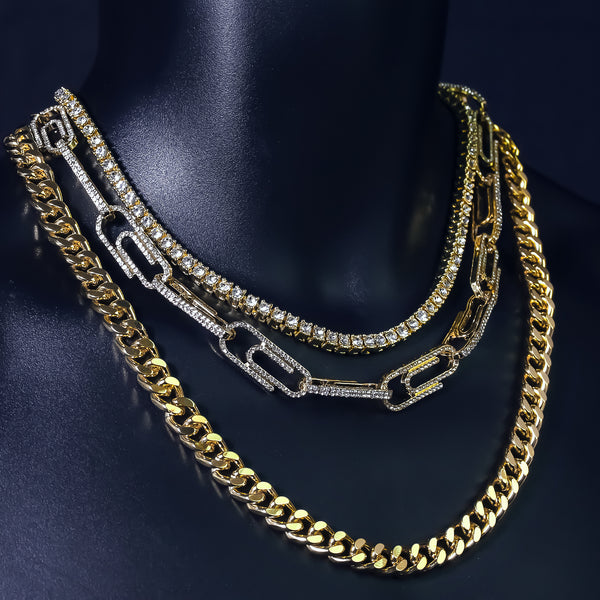 1 Row Cz Tennis Chain Length: 18" Inches Width: 5mm Cz Paper Clip Link Chain Length: 20"Inches Width:10mm 14k Gold Plated Miami Cuban Chain Length: 24"Inches Width: 10mm High-impact 14k Gold...