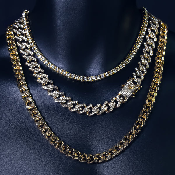 1 Row Cz Tennis Chain Length: 18" Inches Width: 5mm Cz Prong Miami Cuban Style Chain Length: 20"Inches Width:10mm 14k Gold Plated Miami Cuban Chain Length: 24"Inches Width: 10mm High-impact 14k...