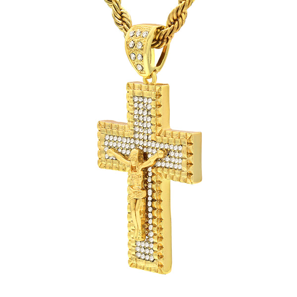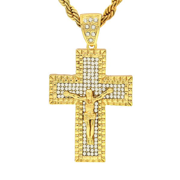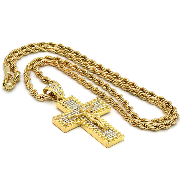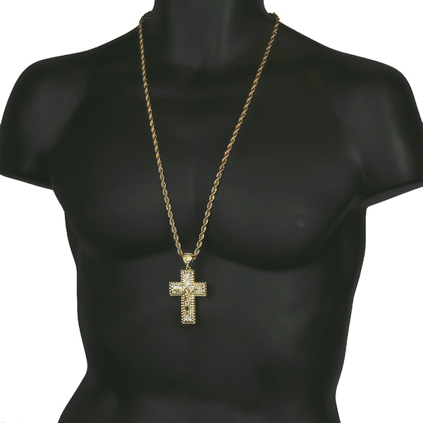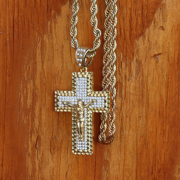 14k Gold Filled CZ Jesus Hang Cross2 Pendant with Rope Chain