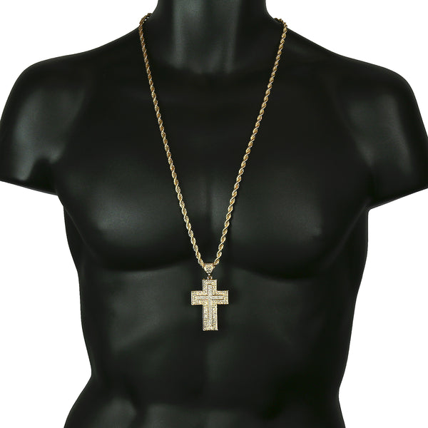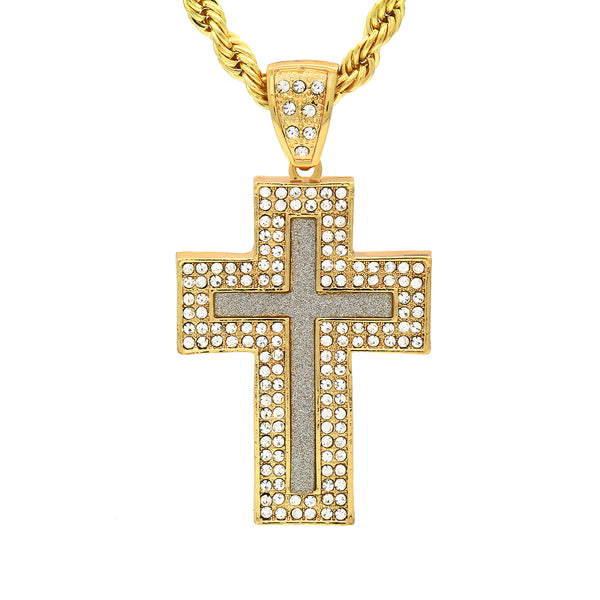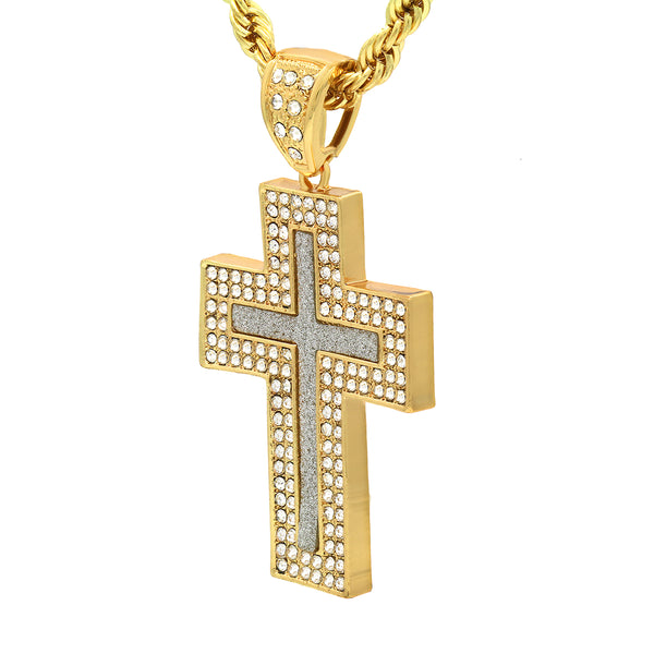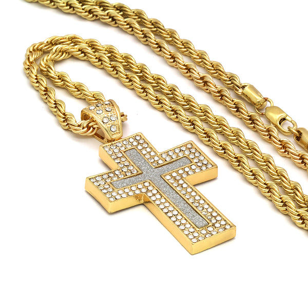 14k Gold Filled Fully Ice Out Stardust Middle Cross Pendant with Rope Chain
