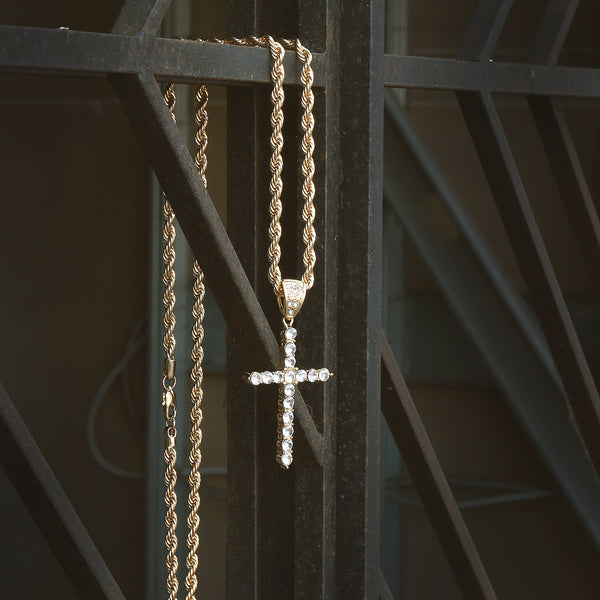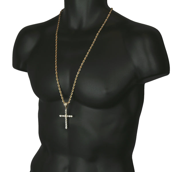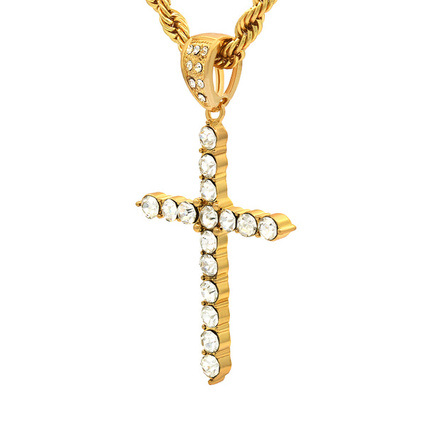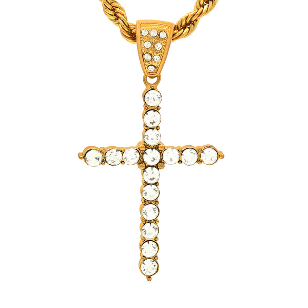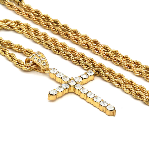 14k Gold Filled Fully Ice Out Gem Cross Pendant with Rope Chain