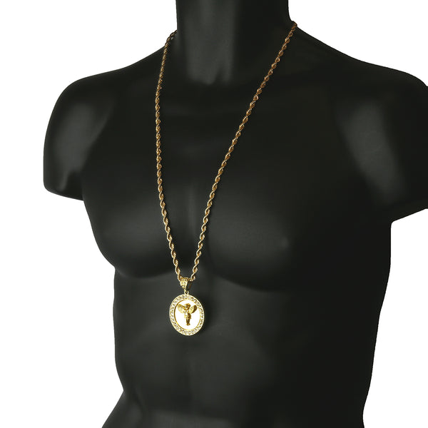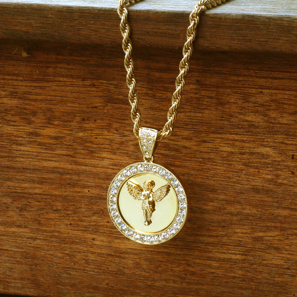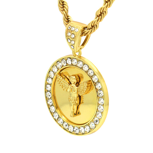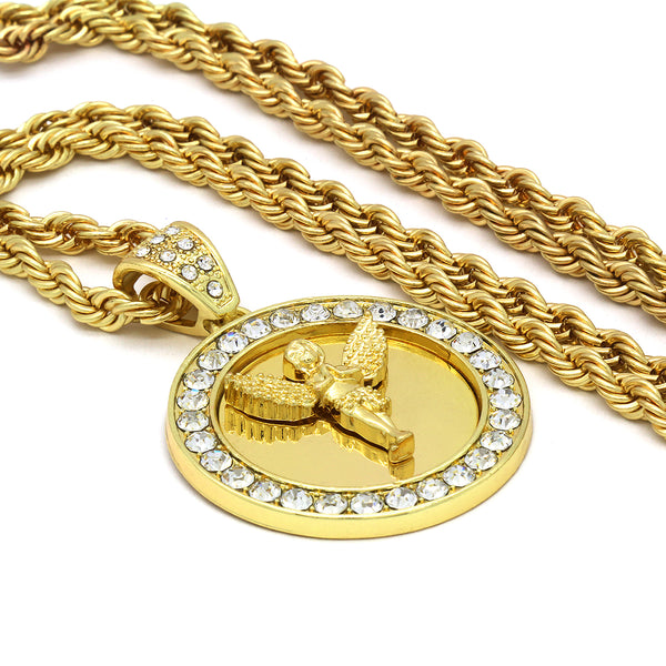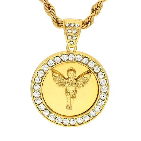 14k Gold Filled Fully Ice Out Round Mirror Angel Pendant with Rope Chain
