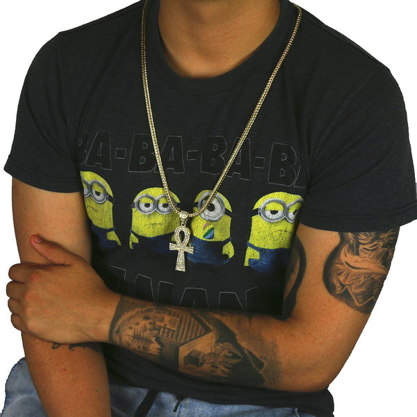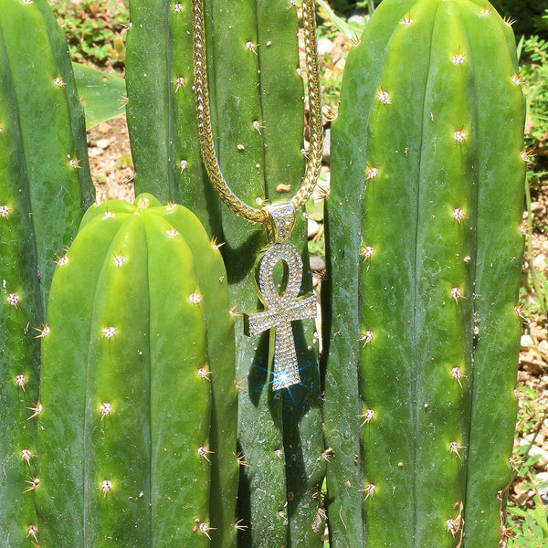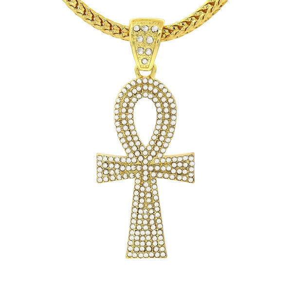 Elegant 14k Gold Plated Ankh Cross Pendant Necklace. High-impact Sparkling Diamond With 14k Lavish Gold Finish over Brass. Lustrous Silky Finish in front of all links. Diamond Lab CZ Iced Out...