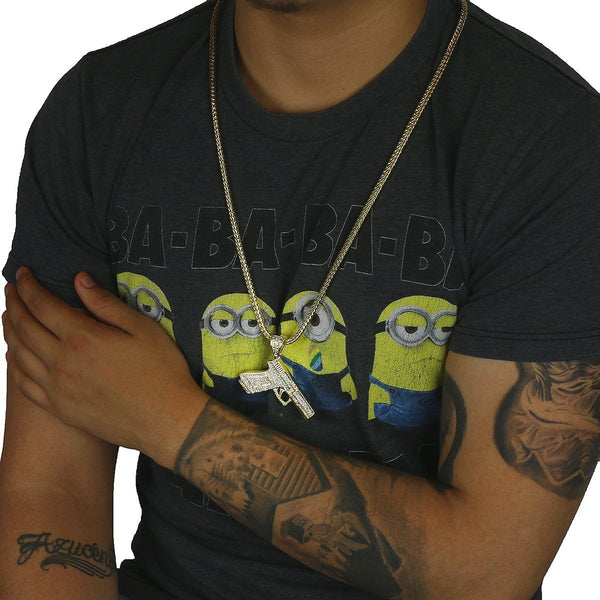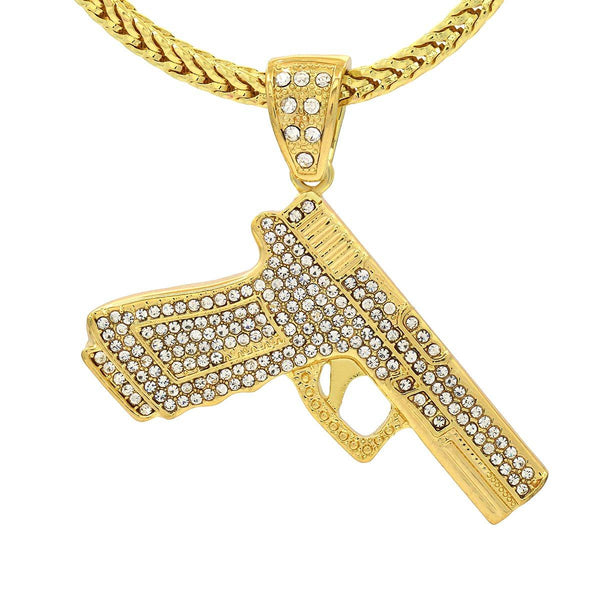 Elegant 14k Gold Plated Hand Gun Pendant Necklace.  High-impact Sparkling Diamond With 14k Lavish Gold Finish over Brass. Lustrous Silky Finish in front of all links. Diamond Lab CZ Iced Out...